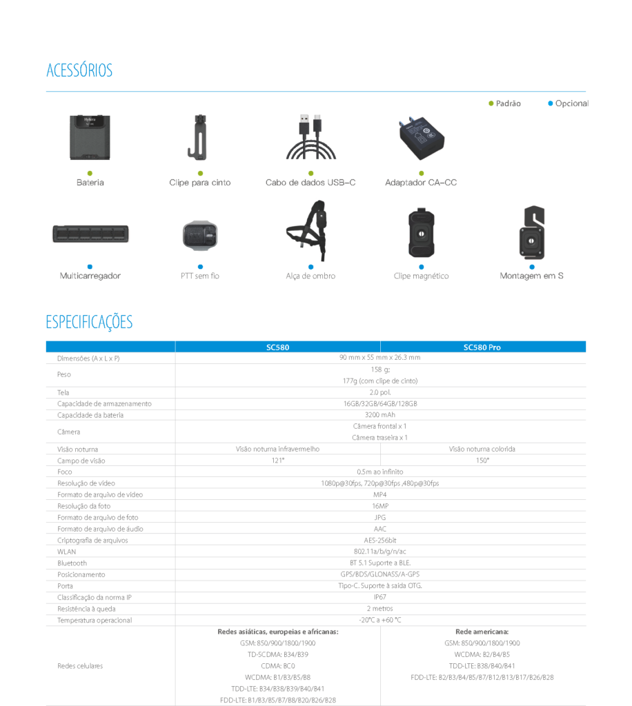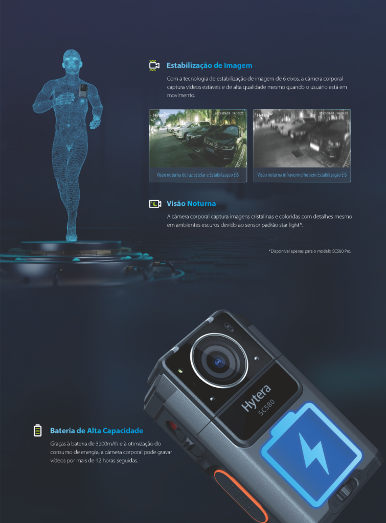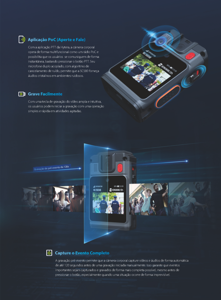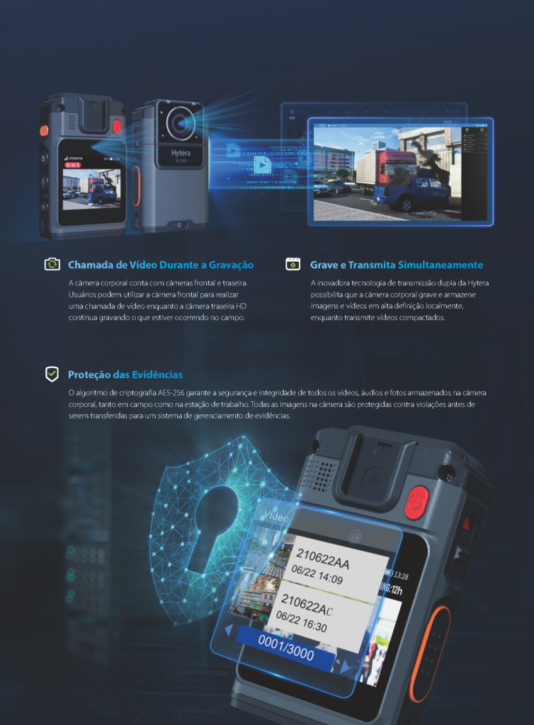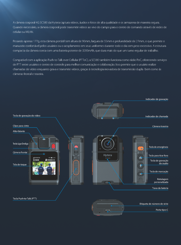 A câmera corporal 4G SC580 da Hytera captura vídeos, áudios e fotos de alta qualidade e os armazena de maneira segura. Quando necessário, a câmera corporal pode transmitir vídeos ao vivo do campo para o centro de comando através de redes de celular ou WLAN.