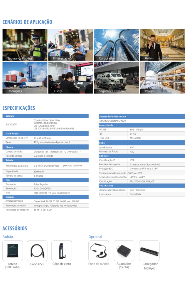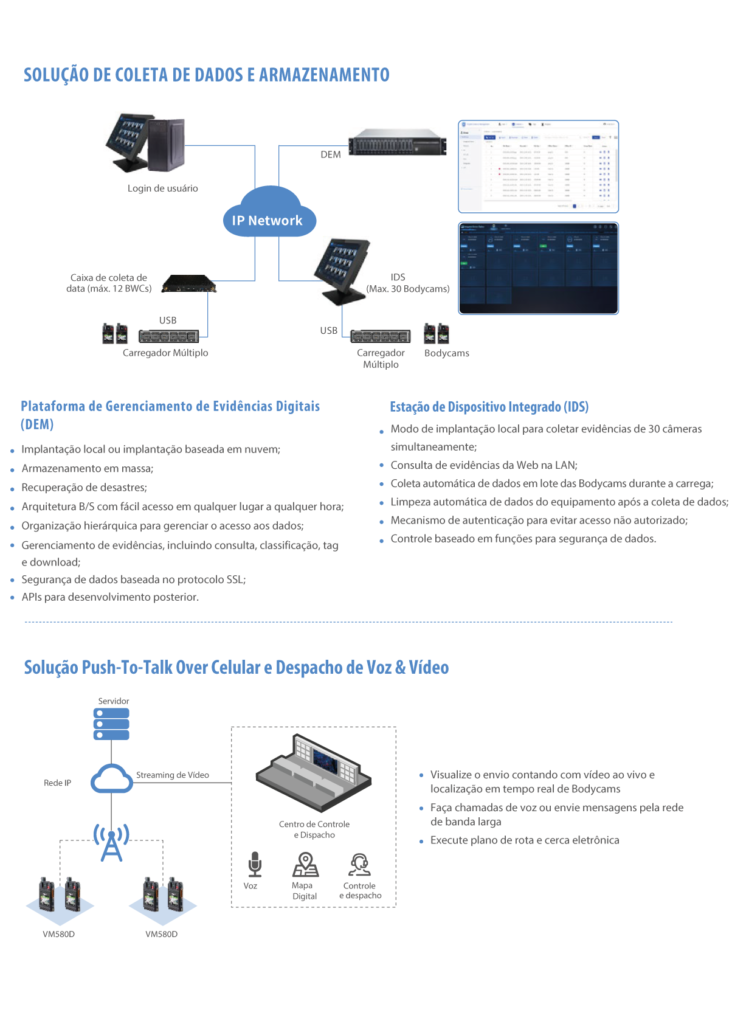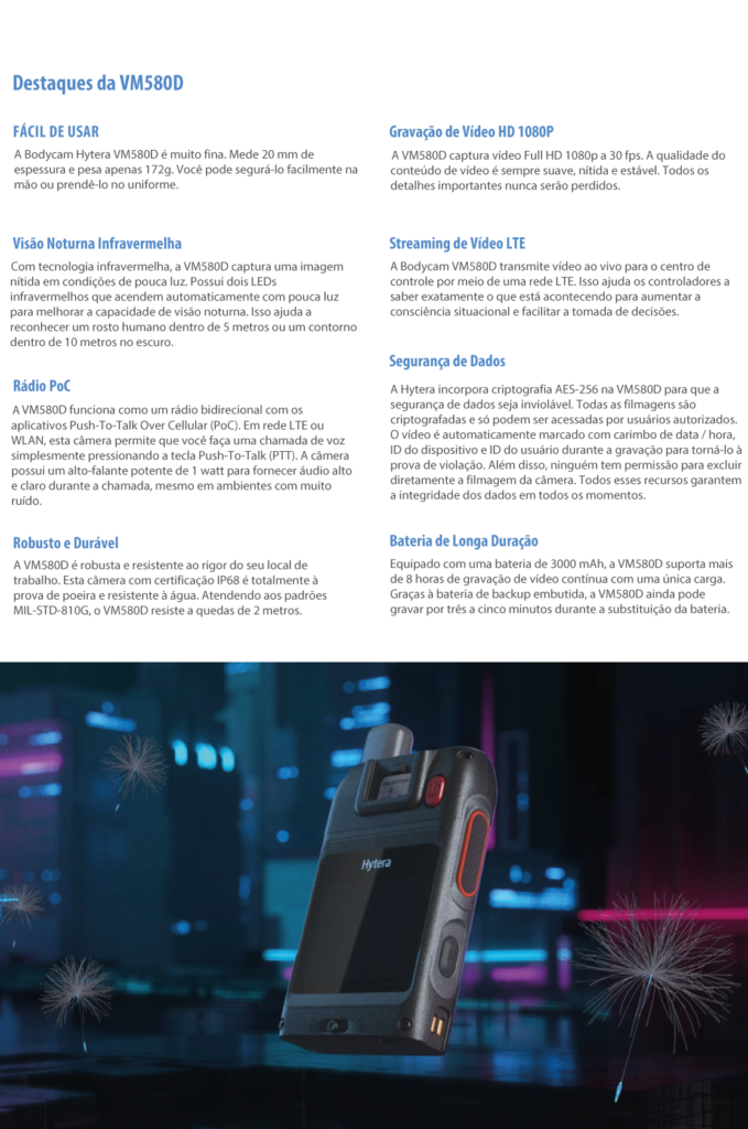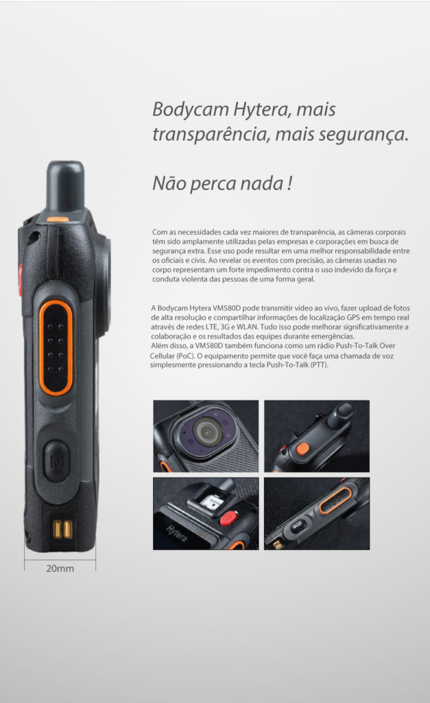 A Bodycam Hytera VM580D pode transmitir vídeo ao vivo, fazer upload de fotos de alta resolução e compartilhar informações de localização GPS em tempo real através de redes LTE, 3G e WLAN.