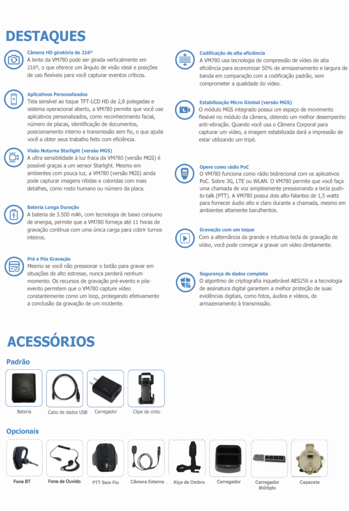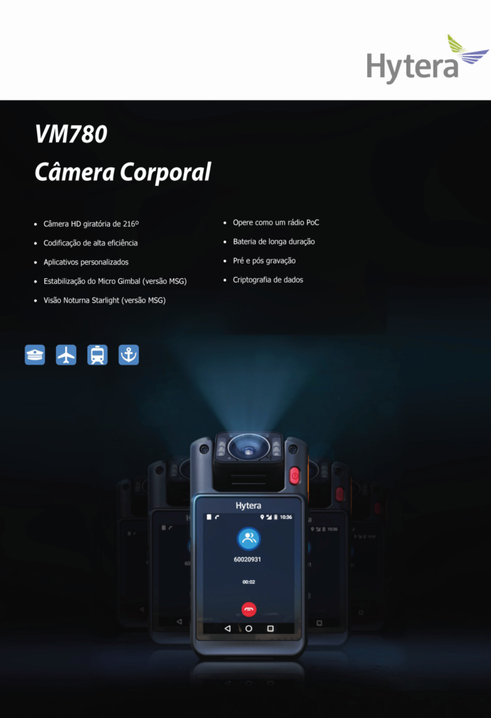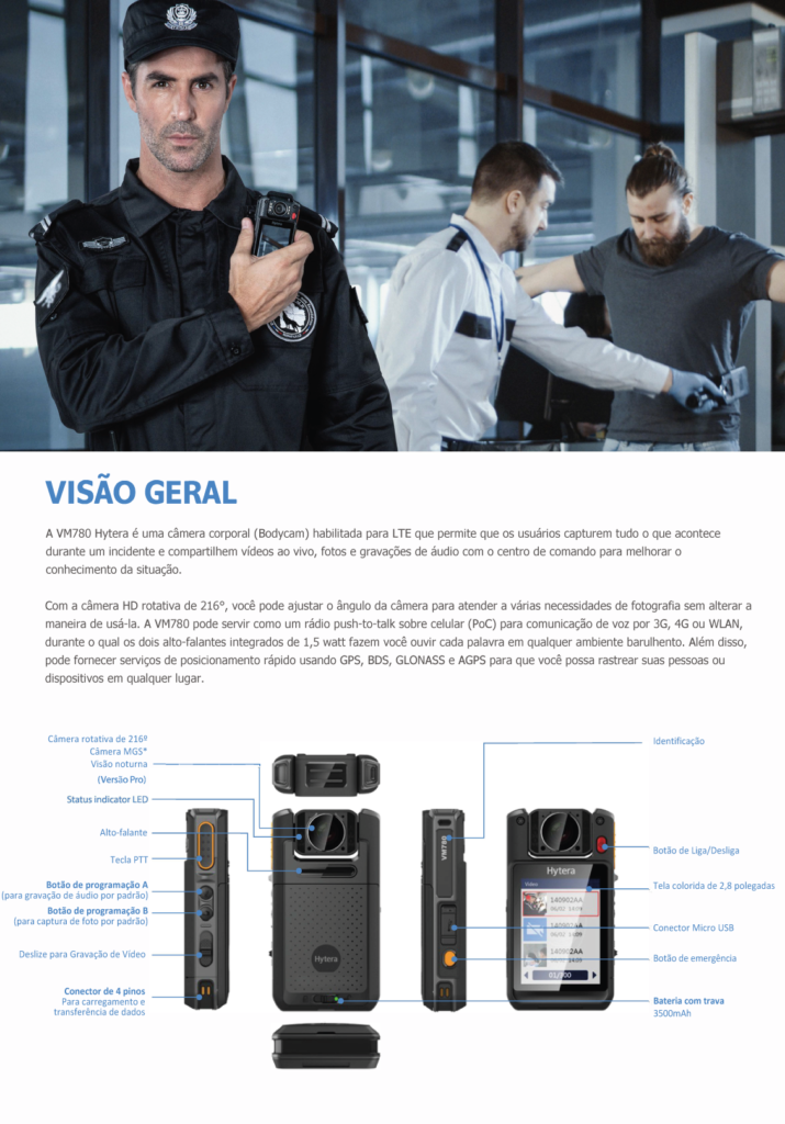 A Bodycam VM780 Hytera é uma câmera corporal (Bodycam) habilitada para LTE que permite que os usuários capturem tudo o que acontece durante um incidente e compartilhem vídeos ao vivo, fotos e gravações de áudio com o centro de comando para melhorar o conhecimento da situação.
