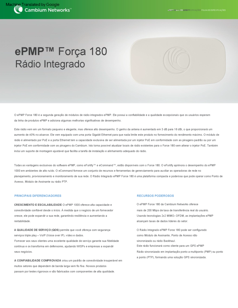 O ePMP Force 180 é a segunda geração de módulos de rádio integrados ePMP. Ele possui a confiabilidade e a qualidade excepcionais que os usuários esperam da linha de produtos ePMP e adiciona algumas melhorias significativas de desempenho.
