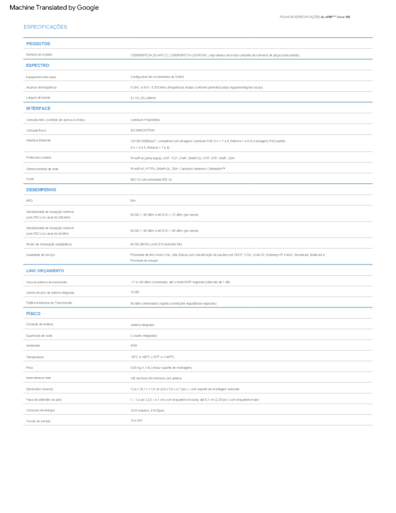 O módulo de rádio é alimentado por PoE e a porta Ethernet tem a capacidade exclusiva de ser alimentada por um injetor PoE em conformidade com as pinagens padrão ou por um injetor PoE em conformidade com as pinagens do Cambium. Isto torna possível atualizar locais de rádio existentes para o Force 180 sem alterar o injetor PoE. Também inclui um suporte de montagem ajustável que facilita a tarefa de instalação e alinhamento adequado do rádio.