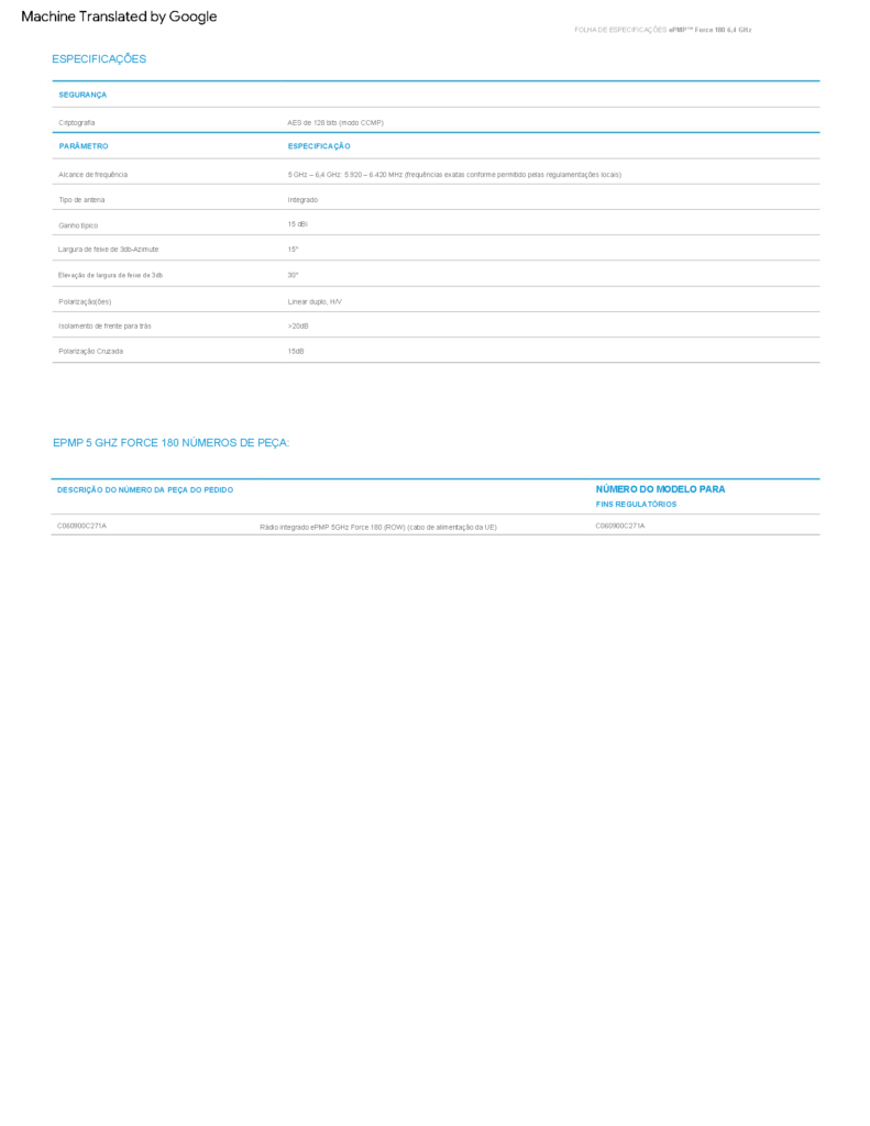 O ePMP Force 180 está agora disponível em uma nova variante de modelo que oferece os mesmos benefícios em 5,9 a 6,4 GHz. A nova antena oferece 15dBi de ganho na banda 5,9 a 6,4, além de orientação horizontal para combater interferências. . Ele vem equipado com uma porta Gigabit Ethernet para que nada limite este produto no fornecimento do rendimento máximo. O módulo de rádio é alimentado por PoE e a porta Ethernet tem a capacidade exclusiva de ser alimentada por um injetor PoE em conformidade com as pinagens padrão ou por um injetor PoE em conformidade com as pinagens do Cambium. Isto torna possível atualizar locais de rádio existentes para o Force 180 sem alterar o injetor PoE. Também inclui um suporte de montagem ajustável que facilita a tarefa de instalação e alinhamento adequado do rádio.