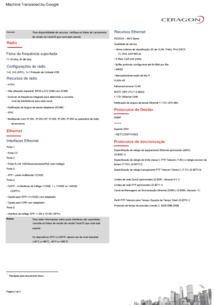 Combinado com o rádio IP-50C ou IP-20C da Ceragon e uma antena multibanda, você pode obter uma solução de 3 portadoras compacta, totalmente externa e de montagem direta (banda E de portadora única + micro-ondas de duas portadoras). Isso economiza na carga da torre e nos requisitos de abrigo, ao mesmo tempo que simplifica a instalação, permite um tempo de lançamento no mercado mais rápido e aumenta a eficiência operacional.
