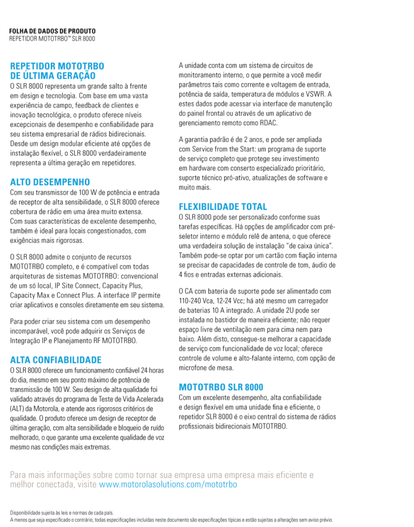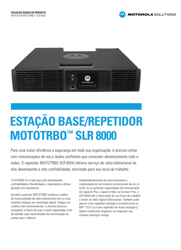 O repetidor MOTOTRBO SLR 8000 oferece serviço de rádio bidirecional de alto desempenho e alta confiabilidade, otimizado para seu local de trabalho.
