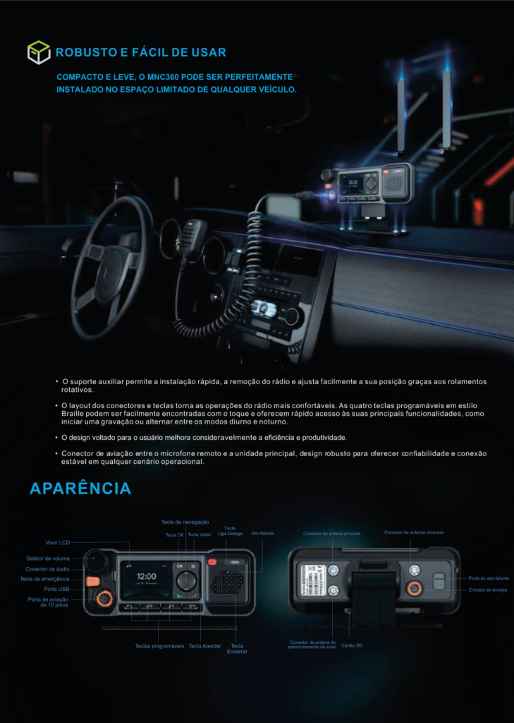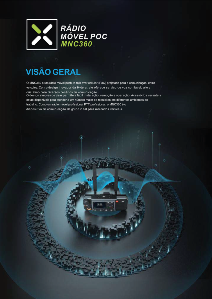 O MNC360 é um rádio móvel push-to-talk over cellular (PoC) projetado para a comunicação entre veículos. Com o design inovador da Hytera, ele oferece serviço de voz confiável, alto e cristalino para diversos cenários de comunicação. O design simples de usar permite a fácil instalação, remoção e operação.