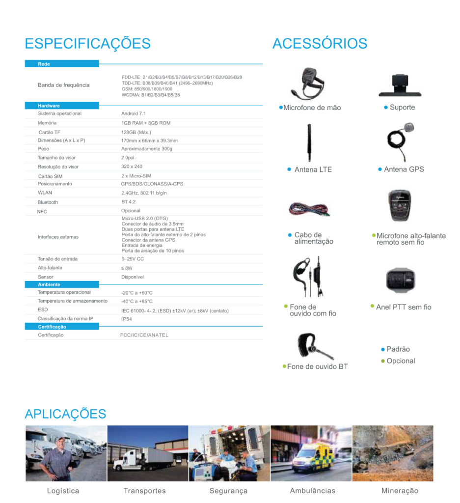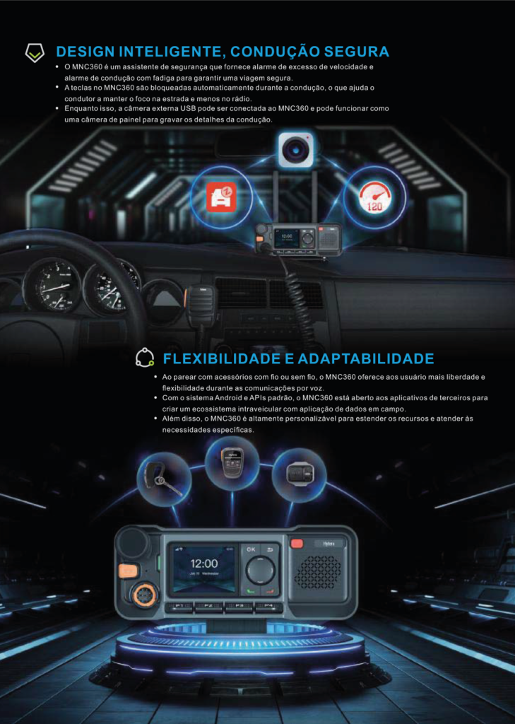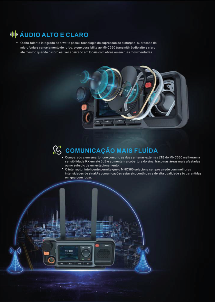 Acessórios versáteis estão disponíveis para atender a um número maior de requisitos em diferentes ambientes de trabalho. Como um rádio móvel profissional PTT profissional, o MNC360 é o dispositivo de comunicação de grupo ideal para mercados verticais