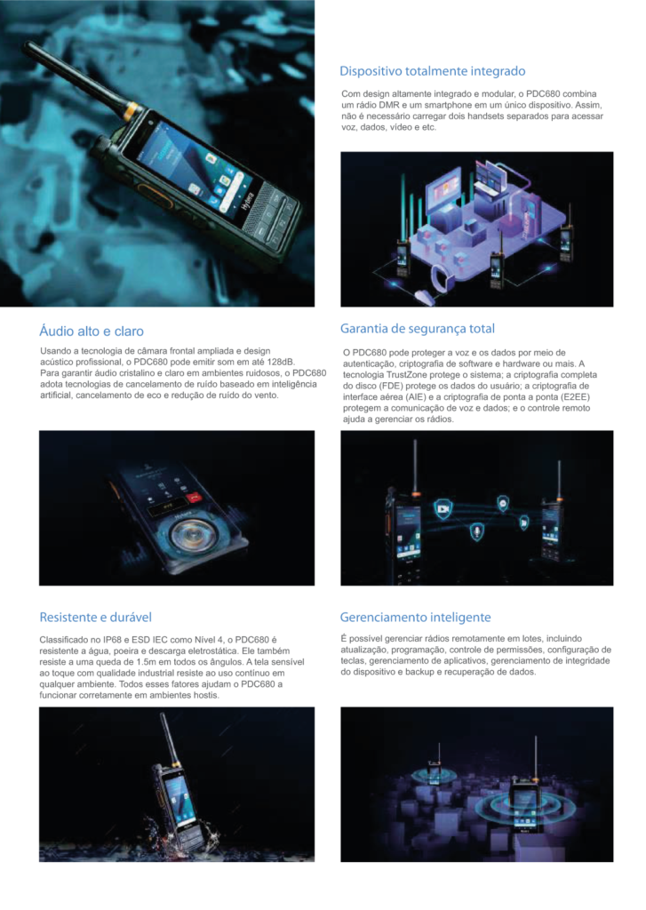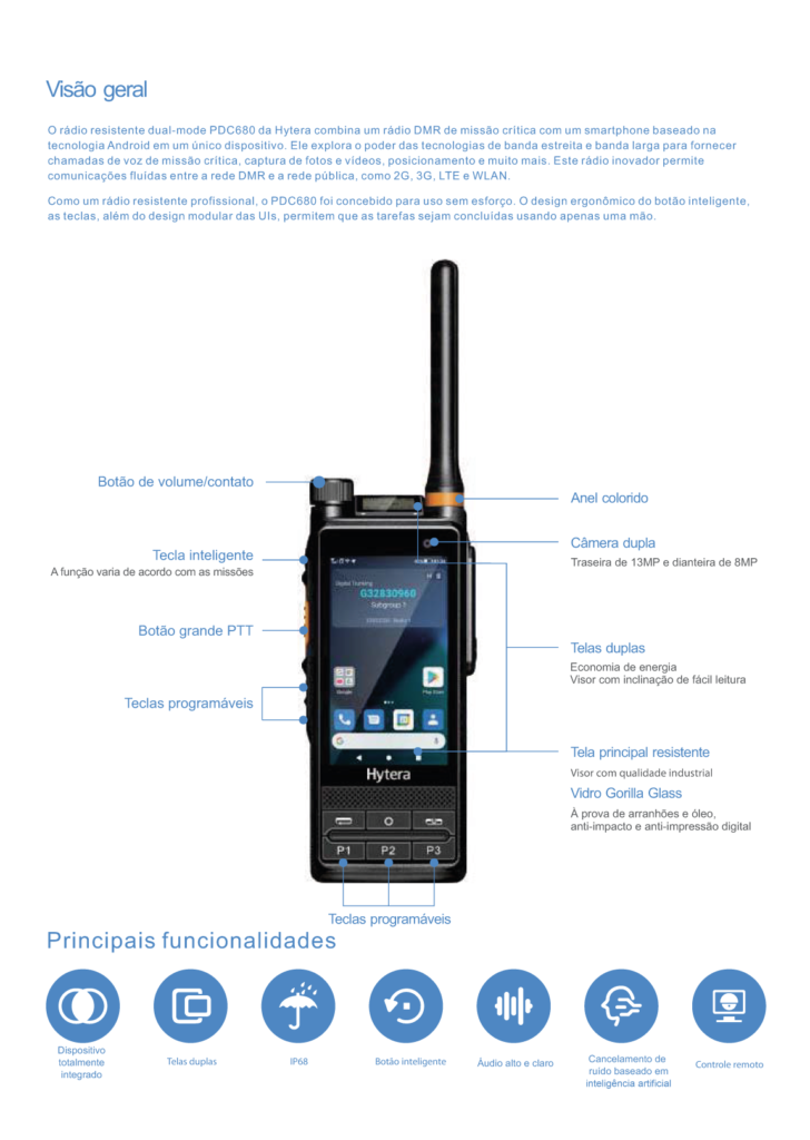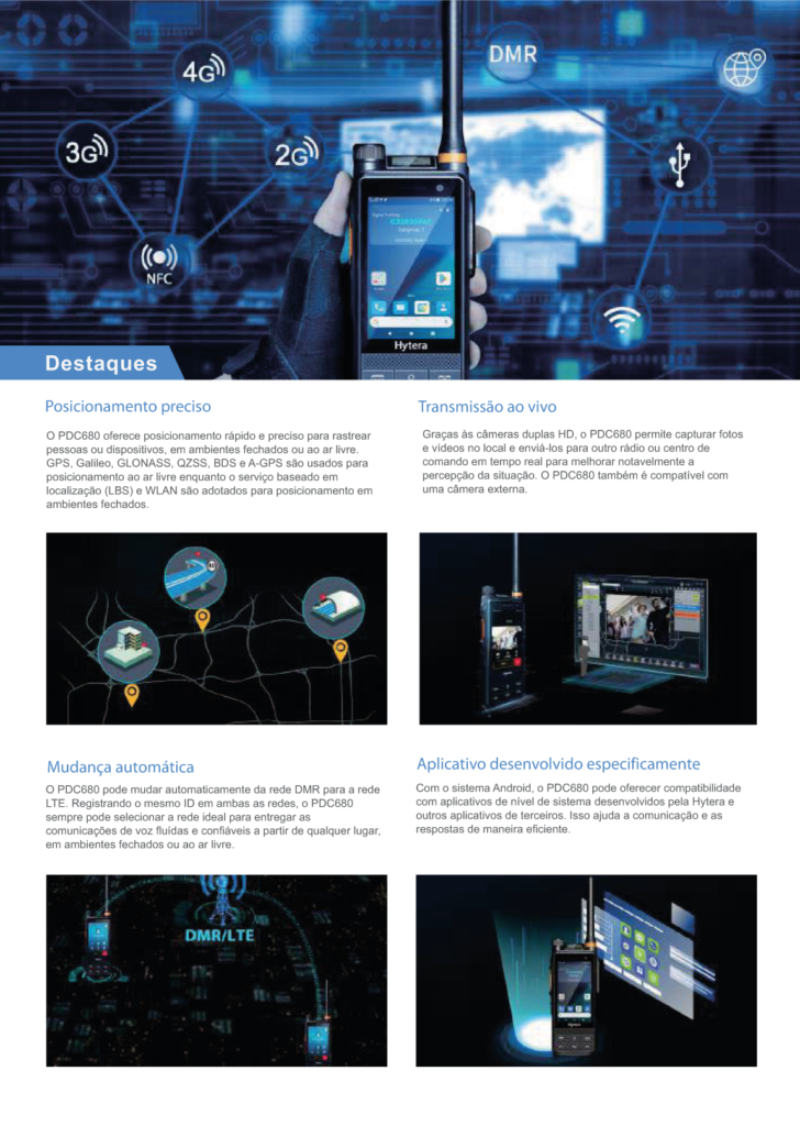 O rádio resistente dual-mode PDC680 da Hytera combina um rádio DMR de missão crítica com um smartphone baseado na tecnologia Android em um único dispositivo. Ele explora o poder das tecnologias de banda estreita e banda larga para fornecer chamadas de voz de missão crítica, captura de fotos e vídeos, posicionamento e muito mais. Este rádio inovador permite comunicações fluídas entre a rede DMR e a rede pública, como 2G, 3G, LTE e WLAN.
