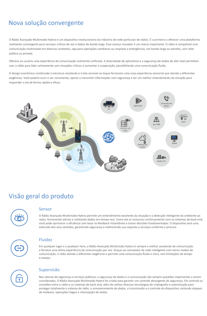 O Rádio Avançado Multimodo Hytera é um dispositivo revolucionário da indústria de rede particular de rádios. É o primeiro a oferecer uma plataforma realmente convergente para serviços críticos de voz e dados de banda larga. Esse avanço inovador é um marco importante. O rádio é compatível com comunicação multimodal em diversos contextos, seja para operações cotidianas ou resposta a emergências, em banda larga ou estreita, com rede pública ou privada.