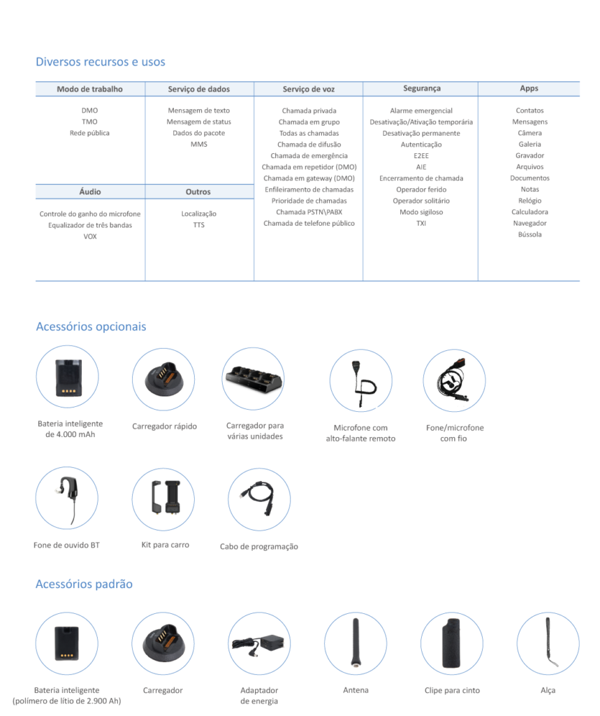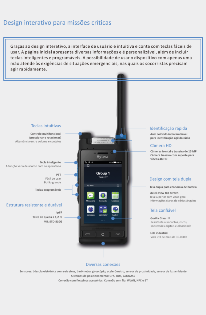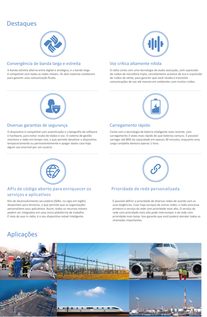 O design econômico combinado à estrutura resistente e à tela sensível ao toque fornecem uma nova experiência sensorial que atende a diferentes exigências. Você poderá ouvir e ver claramente, operar e transmitir informações com segurança e ter um melhor entendimento da situação para responder a ela de forma rápida e eficaz.