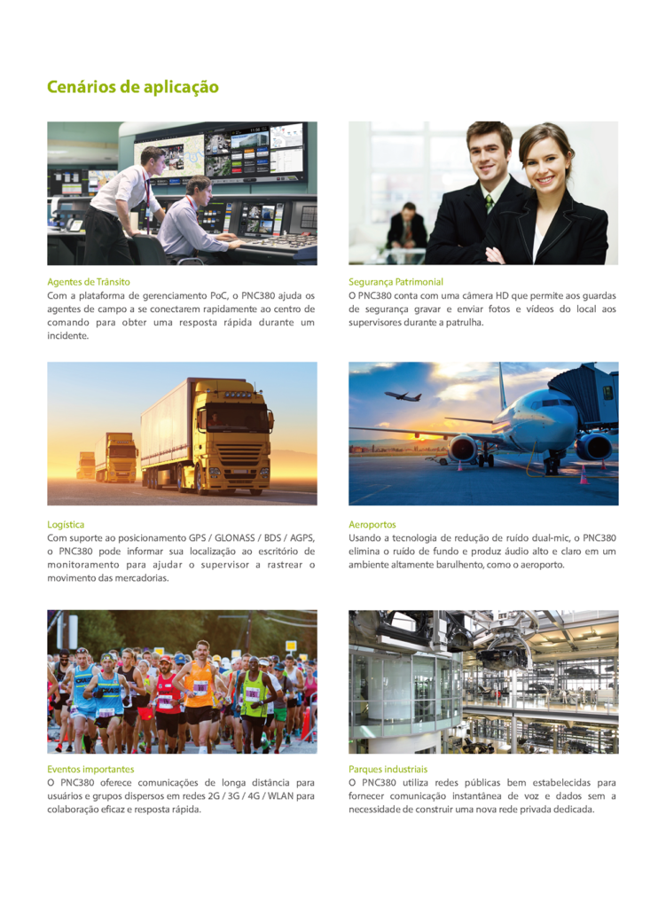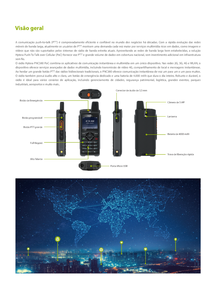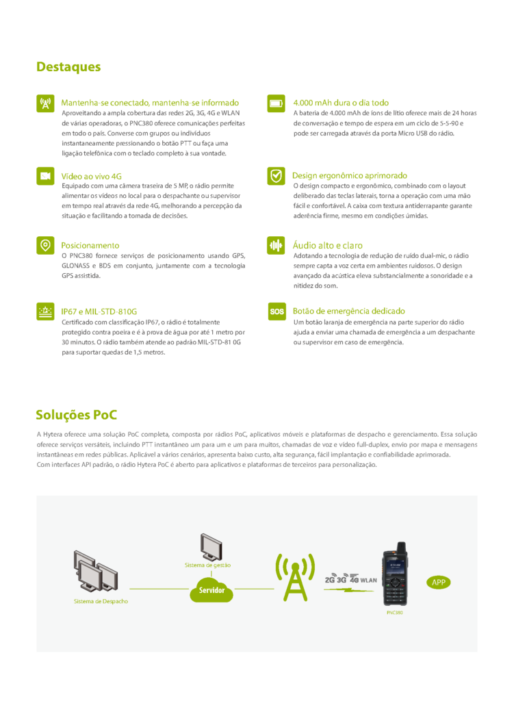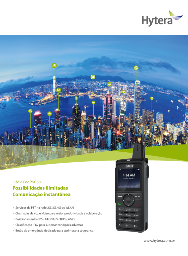 O rádio Hytera PNC380 PoC combina os aplicativos de comunicação instantânea e multimídia em um único dispositivo. Nas redes 2G, 3G, 4G e WLAN, o dispositivo oferece serviços avançados de dados multimídia, incluindo transmissão de vídeo 4G, compartilhamento de local e mensagens instantâneas.