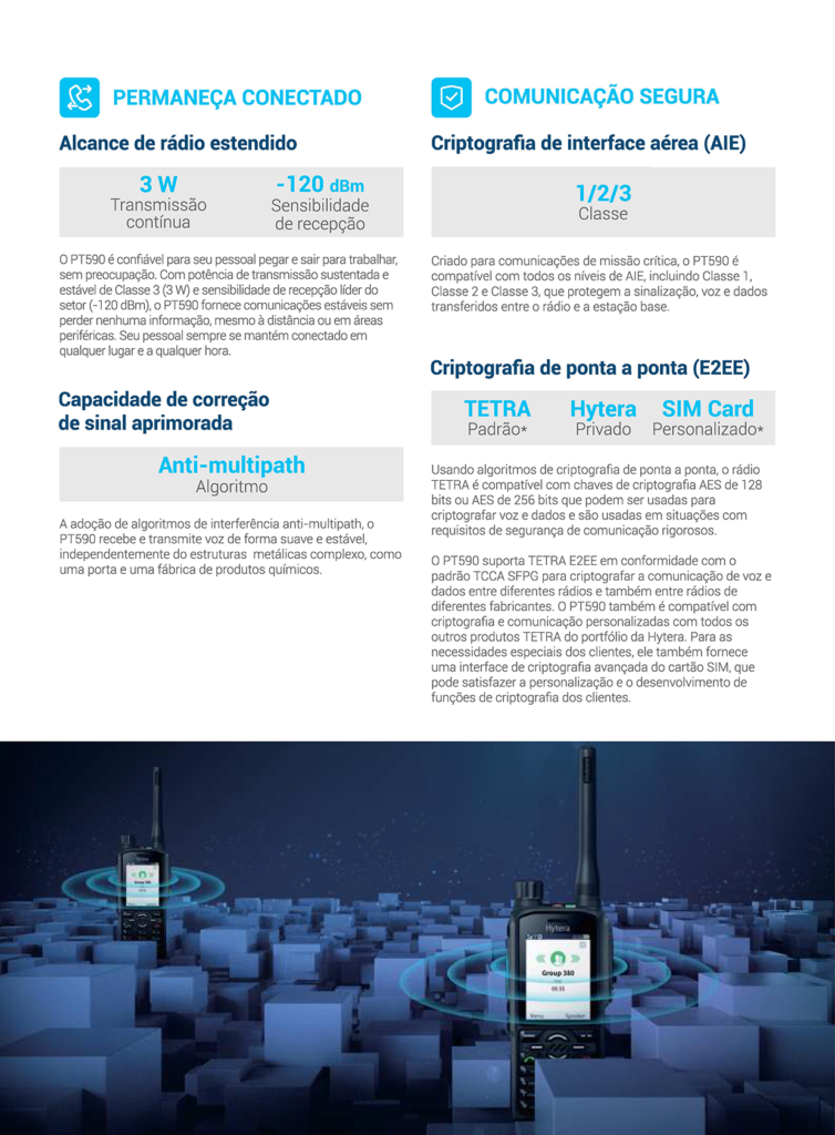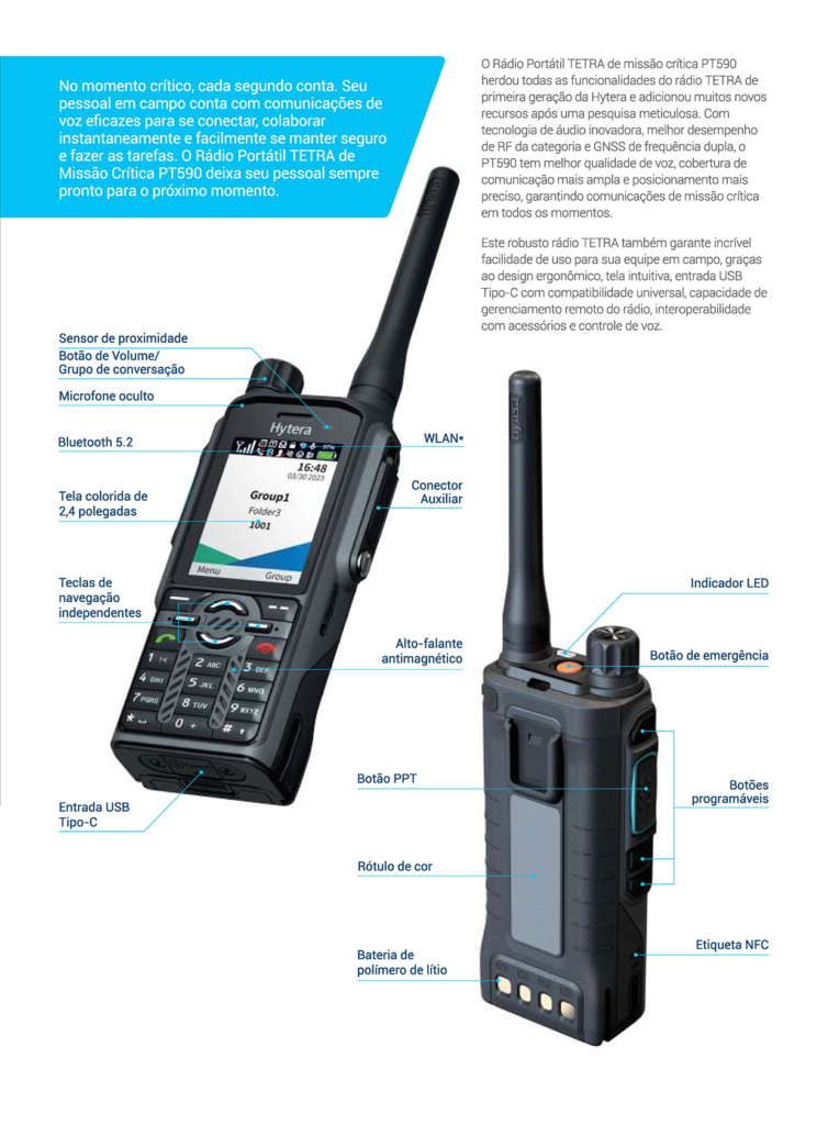 O Rádio Portátil TETRA de missão crítica PT590 herdou todas as funcionalidades do rádio TETRA de primeira geração da Hytera e adicionou muitos novos recursos após uma pesquisa meticulosa. Com tecnologia de áudio inovadora, melhor desempenho de RF da categoria e GNSS de frequência dupla, o PT590 tem melhor qualidade de voz, cobertura de comunicação mais ampla e posicionamento mais preciso, garantindo comunicações de missão crítica em todos os momentos.