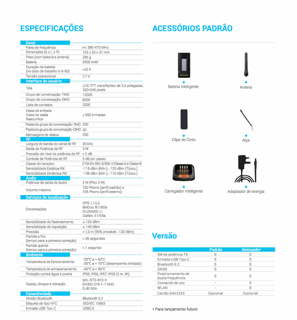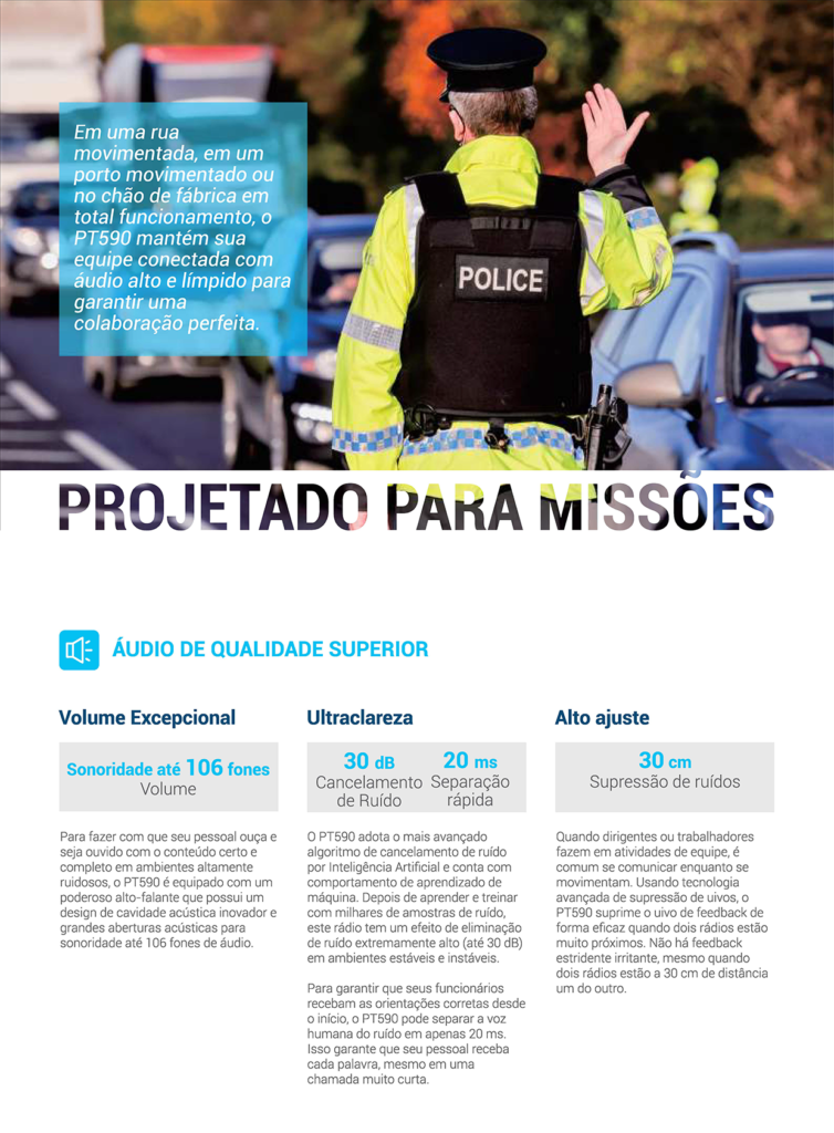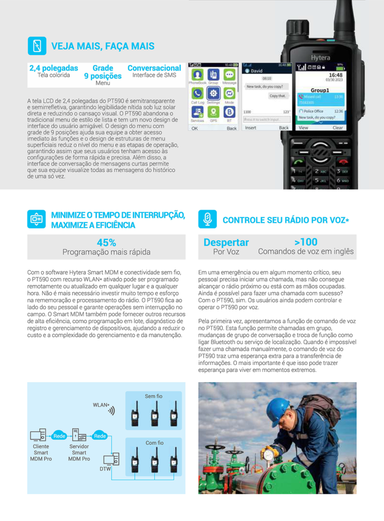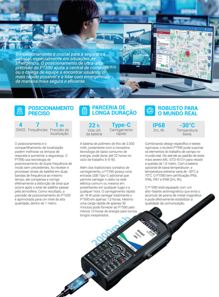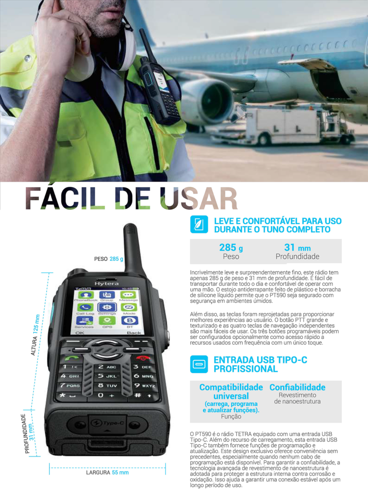 Este robusto rádio TETRA também garante incrível facilidade de uso para sua equipe em campo, graças ao design ergonômico, tela intuitiva, entrada USB Tipo-e com compatibilidade universal, capacidade de gerenciamento remoto do rádio, interoperabilidade com acessórios e controle de voz.