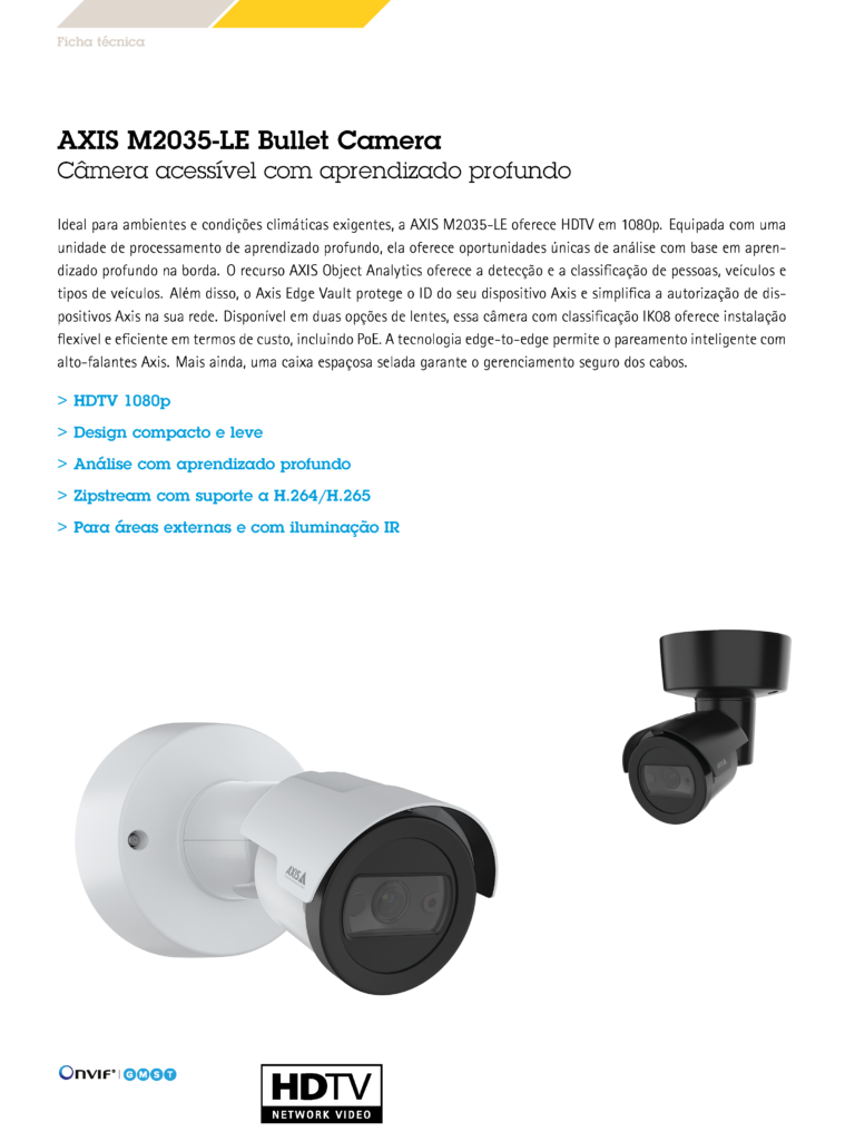 Ideal para ambientes e condições climáticas exigentes, a AXIS M2035-LE oferece HDTV em 1080p. Equipada com uma unidade de processamento de aprendizado profundo, ela oferece oportunidades únicas de análise com base em aprendizado profundo na borda. O recurso AXIS Object Analytics oferece a detecção e a classificação de pessoas, veículos e tipos de veículos. Além disso, o Axis Edge Vault protege o ID do seu dispositivo Axis e simplifica a autorização de dispositivos Axis na sua rede. Disponível em duas opções de lentes, essa câmera com classificação IK08 oferece instalação flexível e eficiente em termos de custo, incluindo PoE. A tecnologia edge-to-edge permite o pareamento inteligente com alto-falantes Axis. Mais ainda, uma caixa espaçosa selada garante o gerenciamento seguro dos cabos.