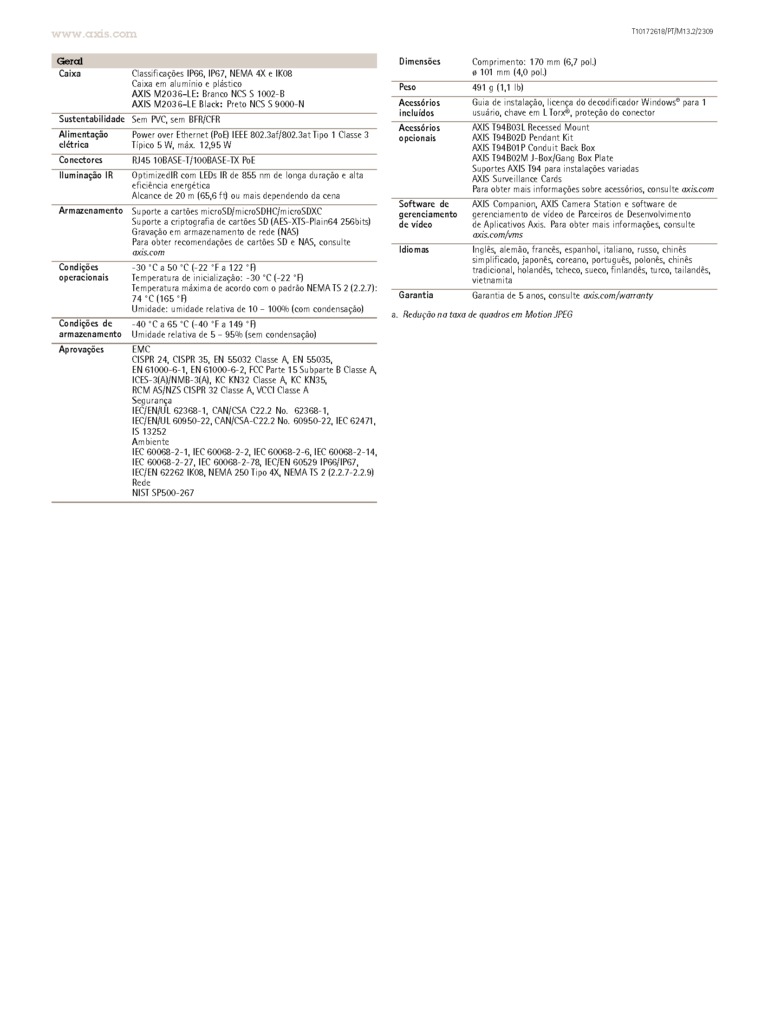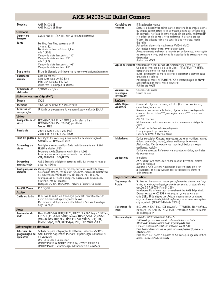 Ideal para ambientes e condições climáticas exigentes, a AXIS M2036-LE oferece Quad HD 4MP 1440p/4 MP. Equipada com uma unidade de processamento de aprendizado profundo, ela oferece oportunidades únicas de análise com base em aprendizado profundo na borda. O recurso AXIS Object Analytics oferece a detecção e a classificação de pessoas, veículos e tipos de veículos. Além disso, o Axis Edge Vault protege o ID do seu dispositivo Axis e simplifica a autorização de dispositivos Axis na sua rede. Essa câmera com classificação IK08 oferece instalação flexível e eficiente em termos de custo, incluindo suporte a PoE. A tecnologia edge-to-edge permite o pareamento inteligente com alto-falantes Axis. Mais ainda, uma caixa espaçosa selada garante o gerenciamento seguro dos cabos.