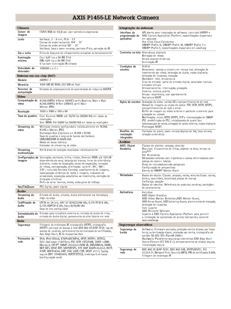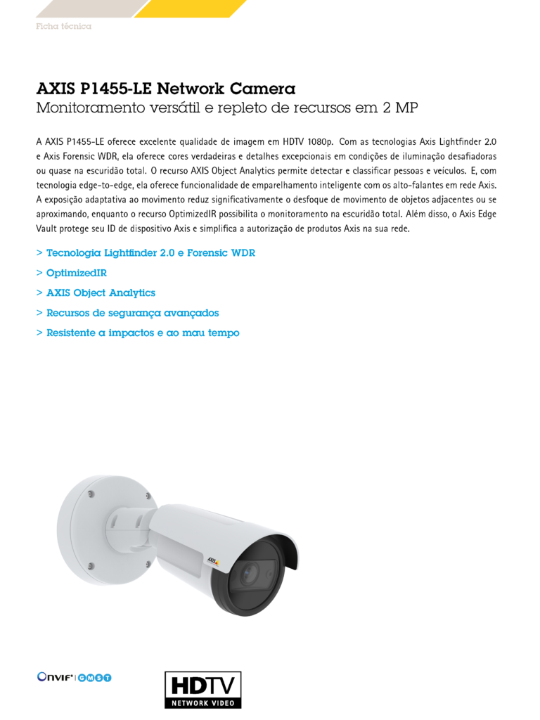 A AXIS P1455-LE oferece excelente qualidade de imagem em HDTV 1080p. Com as tecnologias Axis Lightfinder 2.0 e Axis Forensic WDR, ela oferece cores verdadeiras e detalhes excepcionais em condições de iluminação desafiadoras ou quase na escuridão total. O recurso AXIS Object Analytics permite detectar e classificar pessoas e veículos. E, com tecnologia edge-to-edge, ela oferece funcionalidade de emparelhamento inteligente com os alto-falantes em rede Axis. A exposição adaptativa ao movimento reduz significativamente o desfoque de movimento de objetos adjacentes ou se aproximando, enquanto o recurso OptimizedIR possibilita o monitoramento na escuridão total. Além disso, o Axis Edge Vault protege seu ID de dispositivo Axis e simplifica a autorização de produtos Axis na sua rede.
