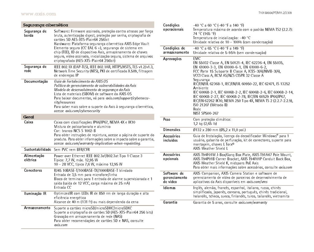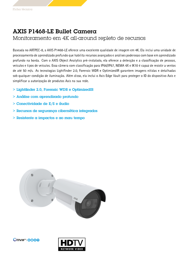 Baseada no ARTPEC-8, a AXIS P1468-LE oferece uma excelente qualidade de imagem em 4K. Ela inclui uma unidade de processamento de aprendizado profundo que habilita recursos avançados e análises poderosas com base em aprendizado profundo na borda. Com o AXIS Object Analytics pré-instalado, ela oferece a detecção e a classificação de pessoas, veículos e tipos de veículos. Essa câmera com classificação para IP66/IP67, NEMA 4X e IK10 é capaz de resistir a ventos de até 50 m/s. As tecnologias Lightfinder 2.0, Forensic WDR e OptimizedIR garantem imagens nítidas e detalhadas sob qualquer condição de iluminação. Além disso, ela inclui o Axis Edge Vault para proteger o ID do dispositivo Axis e simplificar a autorização de produtos Axis na sua rede.