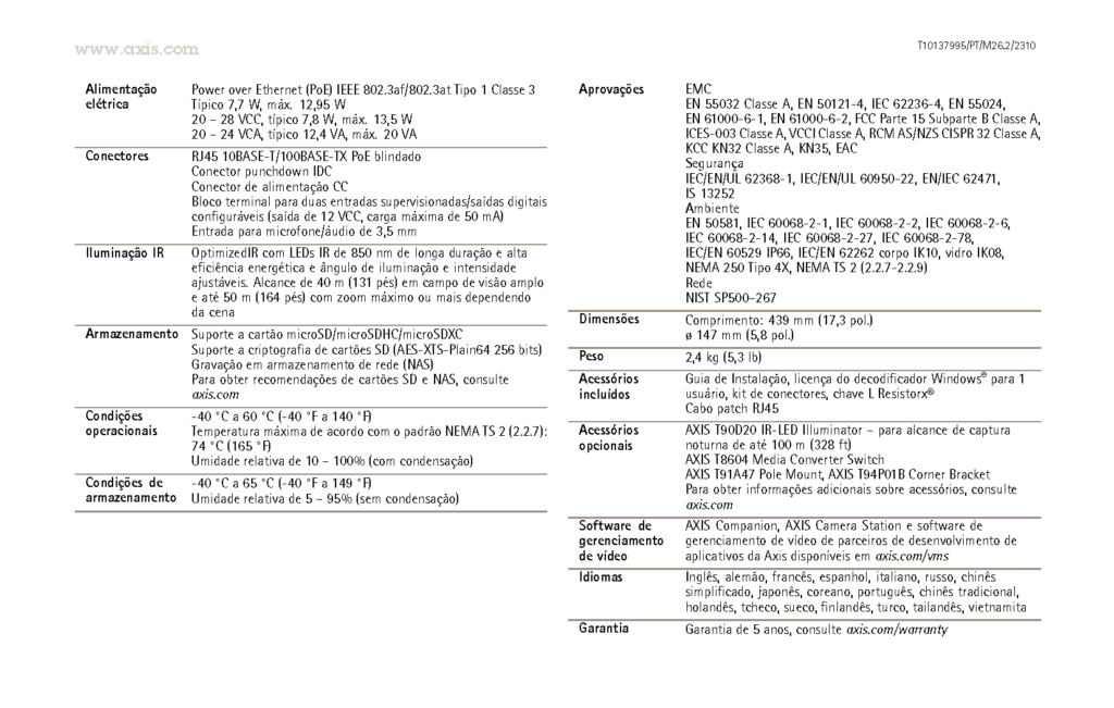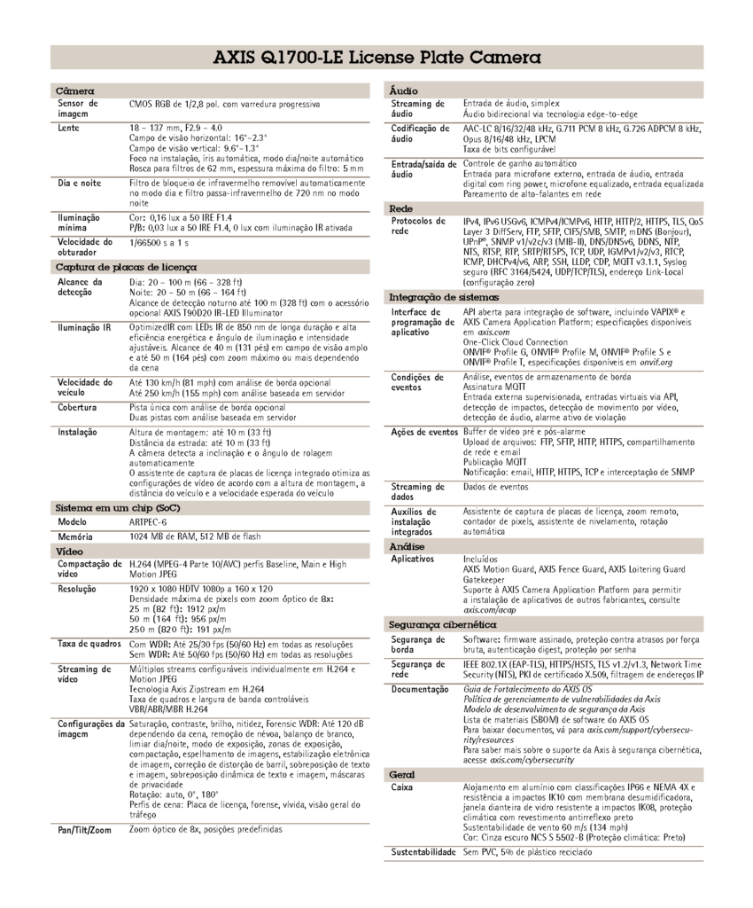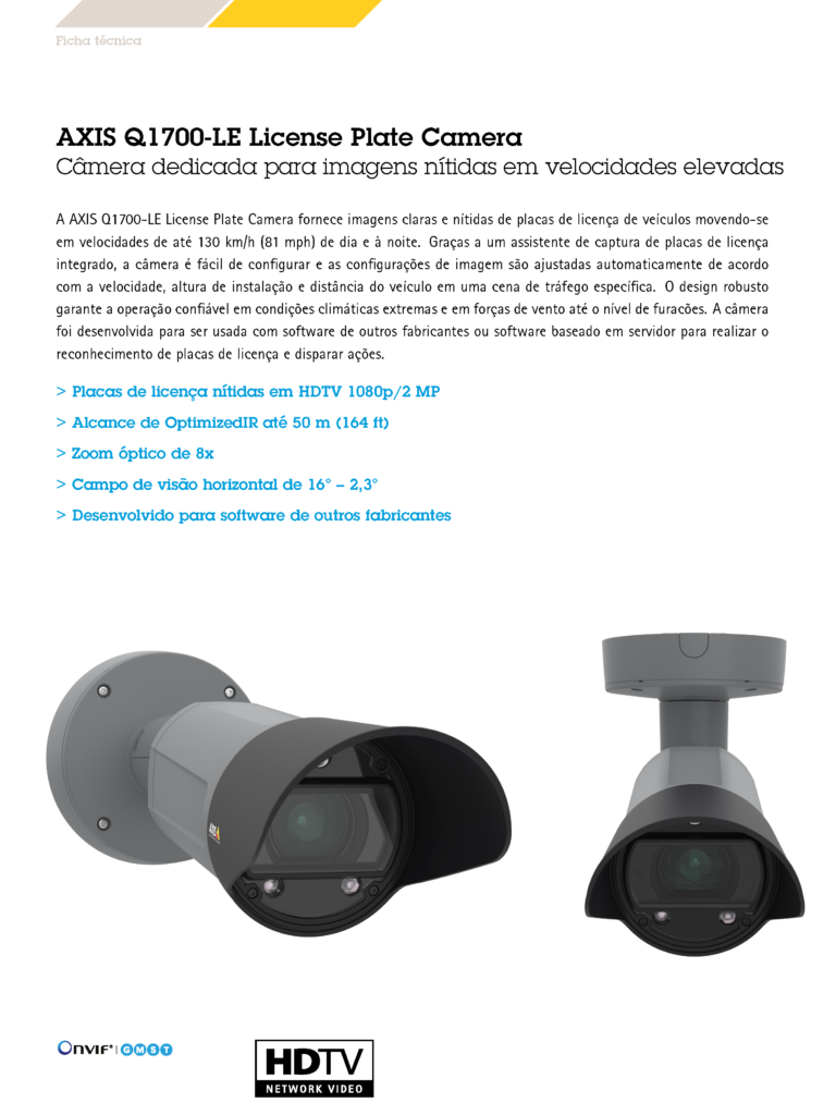 A AXIS Q1700-LE License Plate Camera fornece imagens claras e nítidas de placas de licença de veículos movendo-se em velocidades de até 130 km/h (81 mph) de dia e à noite. Graças a um assistente de captura de placas de licença integrado, a câmera é fácil de configurar e as configurações de imagem são ajustadas automaticamente de acordo com a velocidade, altura de instalação e distância do veículo em uma cena de tráfego específica. O design robusto garante a operação confiável em condições climáticas extremas e em forças de vento até o nível de furacões. A câmera foi desenvolvida para ser usada com software de outros fabricantes ou software baseado em servidor para realizar o reconhecimento de placas de licença e disparar ações.