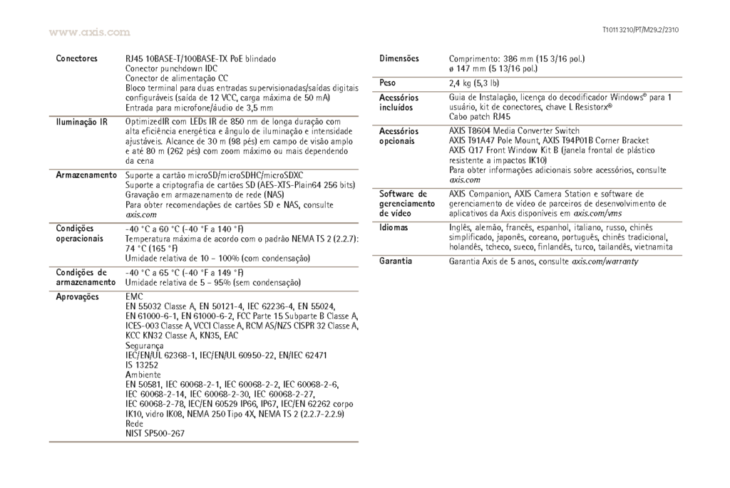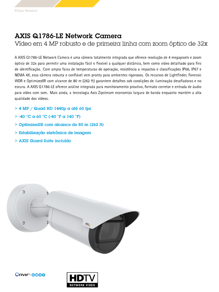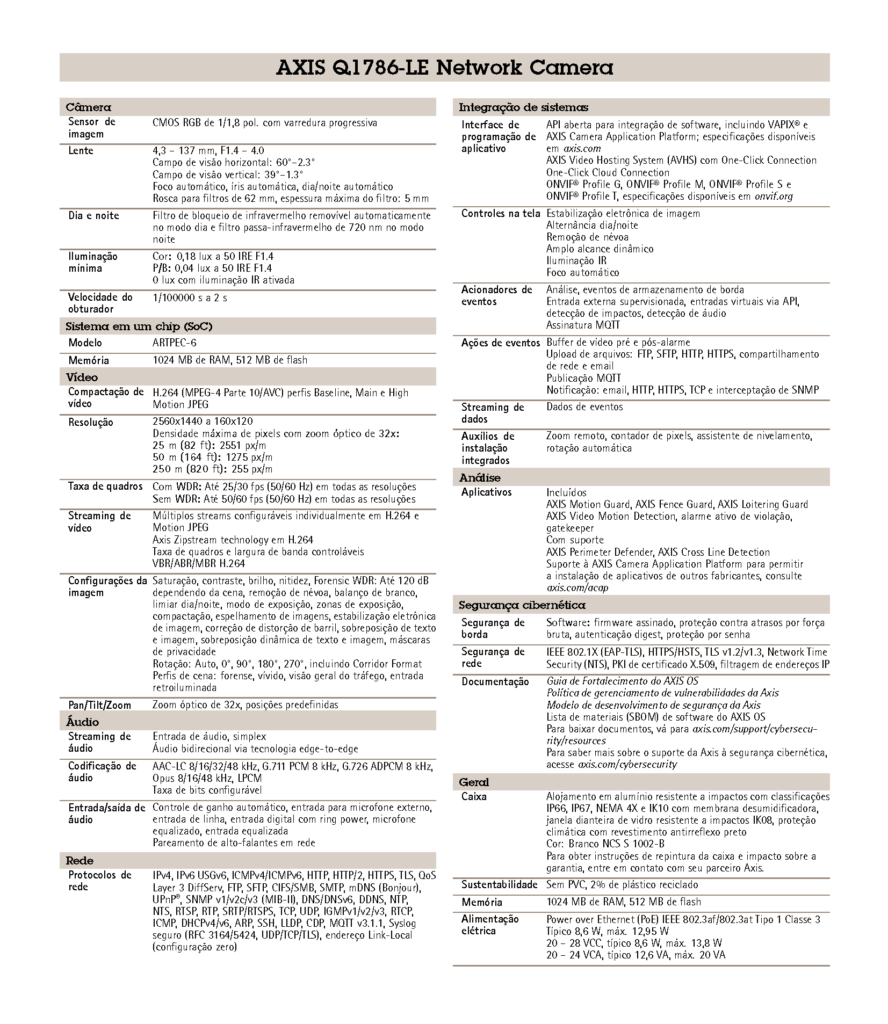A AXIS Q1786-LE Network Camera é uma câmera totalmente integrada que oferece resolução de 4 megapixels e zoom óptico de 32x para permitir uma instalação fácil e flexível a qualquer distância, bem como vídeo detalhado para fins de identificação. Com ampla faixa de temperaturas de operação, resistência a impactos e classificações IP66, IP67 e NEMA 4X, essa câmera robusta e confiável vem pronta para ambientes rigorosos. Os recursos de Lightfinder, Forensic WDR e OptimizedIR com alcance de 80 m (262 ft) garantem detalhes sob condições de iluminação desafiadoras e no escuro. A AXIS Q1786-LE oferece análise integrada para monitoramento proativo, formato corretor e entrada de áudio para vídeo com som. Mais ainda, a tecnologia Axis Zipstream economiza largura de banda enquanto mantém a alta qualidade dos vídeos.