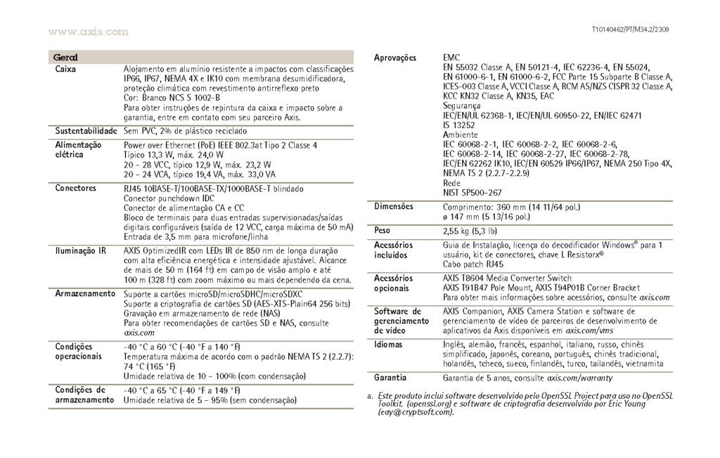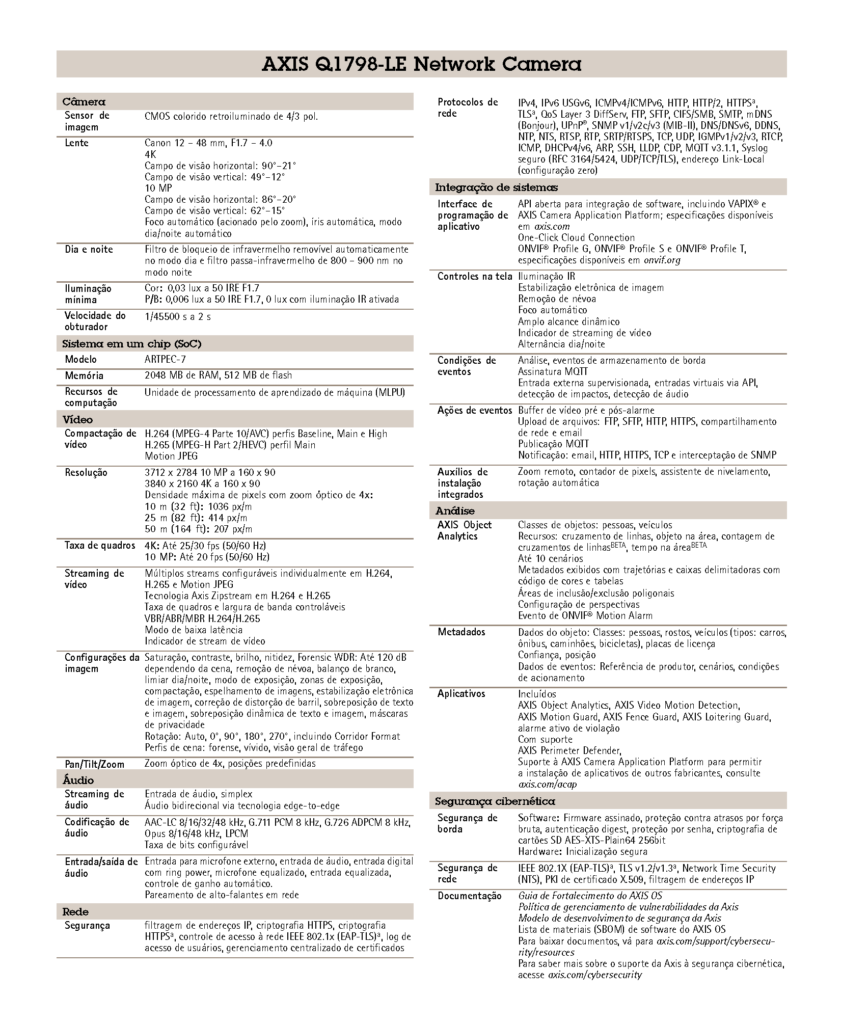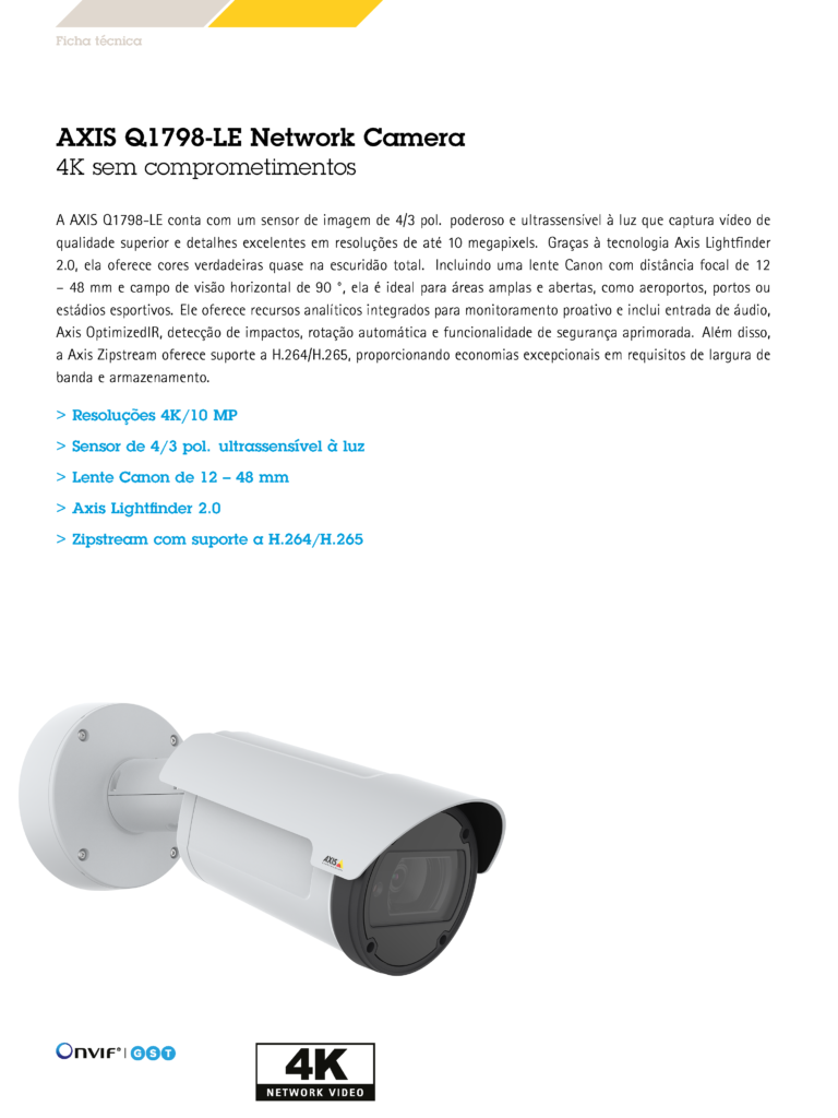 A AXIS Q1798-LE conta com um sensor de imagem de 4/3 pol. poderoso e ultrassensível à luz que captura vídeo de qualidade superior e detalhes excelentes em resoluções de até 10 megapixels. Graças à tecnologia Axis Lightfinder 2.0, ela oferece cores verdadeiras quase na escuridão total. Incluindo uma lente Canon com distância focal de 12 – 48 mm e campo de visão horizontal de 90 °, ela é ideal para áreas amplas e abertas, como aeroportos, portos ou estádios esportivos. Ele oferece recursos analíticos integrados para monitoramento proativo e inclui entrada de áudio, Axis OptimizedIR, detecção de impactos, rotação automática e funcionalidade de segurança aprimorada. Além disso, a Axis Zipstream oferece suporte a H.264/H.265, proporcionando economias excepcionais em requisitos de largura de banda e armazenamento.